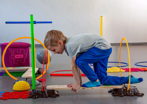 Don't let bad weather spoil children's physical activity. With the MUFFIK obstacle course, you can create a safe and fun playground for little explorers in the comfort of your home. In addition, by combining it with your existing MUFFIK set, you will get a unique orthopedic obstacle course that will support the correct development and coordination of their movement. Lay out the MUFFIK mats to create a fun path full of beams, jumps, and passes. The MUFFIK Active Stump, sticks, circles, wooden footbridges, and balancing stones will serve you for this purpose. Feel free to connect other hidden tools that your household offers, such as cushions, chairs, or tables, to the course and have lots of fun. If the sun is shining outside, take MUFFIK out into the garden to give the children a chance to enjoy their garden obstacle course.
